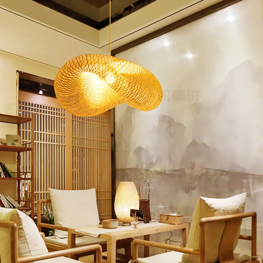 Bambou osier rotin vague pendentif lumière Vintage japonais lampe Suspension maison intérieur Restaurant Table à manger salle lampe Lustre.